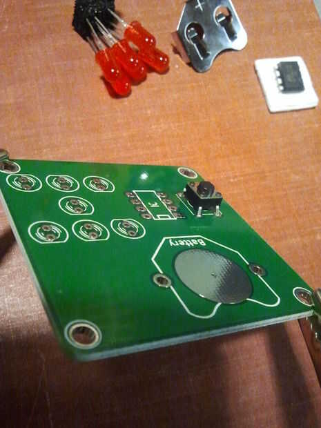 Material, s para mini led dadosHerramientas1 soldador2 alambre de soldadura3 cortador del tablero veroPiezas que necesita1. 8 pines toma ic2. 7 led, s3. pic12f629a4. 10 k ohmios (1)5. altavoz6. batería de lipo 3,7 voltios7. vero board8. los cables9.