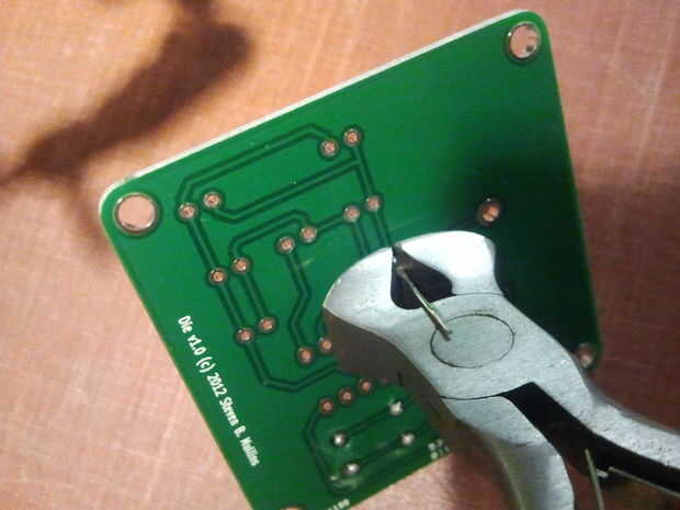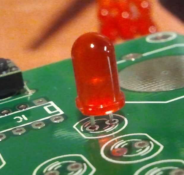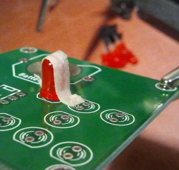 Los LEDs tienen polaridad y se pueden instalar mal. Si te fijas bien, la huella del LED no es un círculo de prefecto. Hay una parte plana del cable negativo. También verá que el positivo es más largo. Tenga cuidado para alinear el lado plano de la huella del diodo con el lado plano de la huella de serigrafiado en la placa. No todos los LEDs punto de la misma manera. Compruebe la polaridad de cada LED antes de soldar en su lugar.