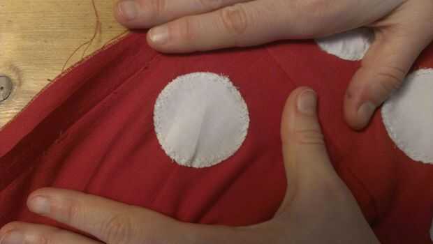 Utilizar la máquina de coser con una costura ancha e hilo del color de tus círculos para coser los puntos a los lados del molde. Utilice las marcas de posición. Asegúrese de ir lento cuando coser como el material necesita ser dado vuelta mucho.