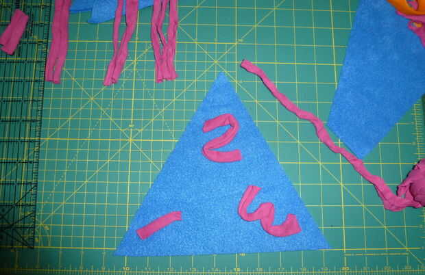 Colocar las tiras de camiseta (color de rosa en las siguientes imágenes) en un lado del dado, inmovilizados los primeros antes de coser, pero no era demasiado malo para solo darles de comer en la máquina de coser a mano alzada.