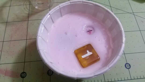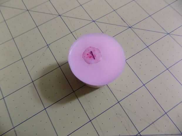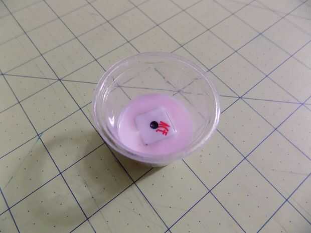 Colocar el dado que quiere moldear en el centro de la taza con la cara de 1 lado para arriba. Insertar en un ángel para que el aire no quedar atrapado en las depresiones de número. Presione hacia abajo por lo que hace contacto con la silicona seca.