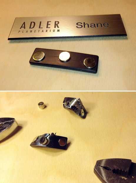 Imanes (2) --quería que las cajas para cerrar con seguridad sin mecanismos externos que sobresalen y coger cosas. Imanes de neodimio parecen que la cosa (son fuertes), pero encontrar pequeños resultó difícil. Sin embargo, mi nombre en el trabajo tiene un respaldo magnético en él. Muy a menudo pierdo mi nombre (ganchos en algo y es derribado sin mí notar generalmente, que la vida de un astrónomo es resistente), pero la espalda magnética cae en mi bolsillo. Siempre mantener estos y los echan en mi caja de materiales. Un poco de trabajo con dos pares de alicates rindió un buen suministro de imanes poco! Probablemente podría encontrarlos en sets exteriormente en una tienda de artículos de oficina.