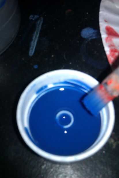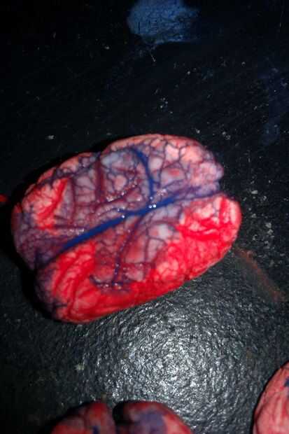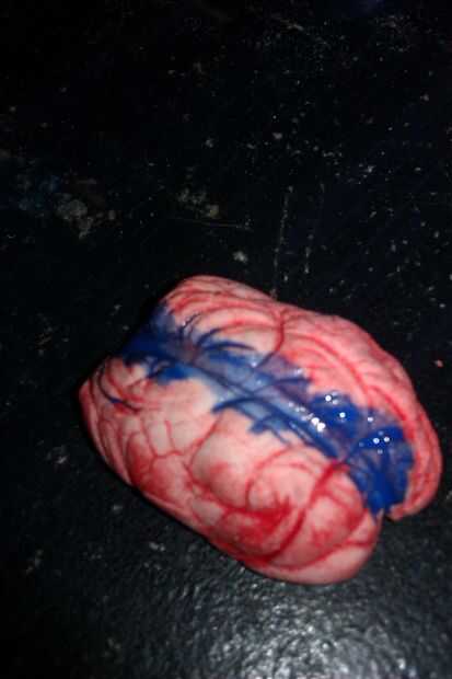 pintura en la tapa de un frasco de aderezo para ensaladas. Mezcla la pintura azul con algo de agua, sobre una proporción de 1:1 debe ser bueno. La idea es conseguir que el flujo hacia abajo de la ranura del cerebro central y a algunos de los surcos del cerebro vía acción capilar. Ajustar cómo es mojado el pincel es la cantidad que desea que el azul al flujo. No quiero rellenar los surcos rojos. Cuánto azul a usar depende de usted. Como diría Bob Ross son sus cerebros poco felizes.