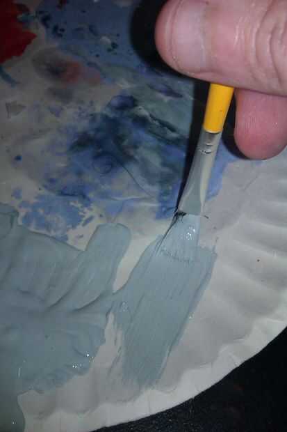 que apriete un poco de pintura blanca en la placa de papel y unas cuantas gotas de negro. Puede utilizar el cepillo, el palito o cualquier cosa que quieras colores mic los dos hasta que tienes un tono de gris que te gusta.