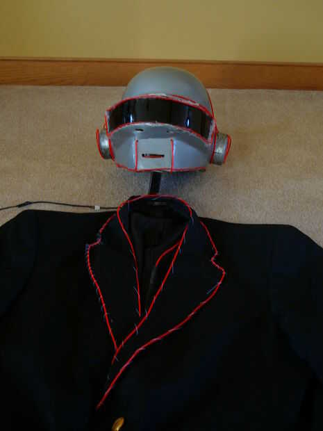 Tron. traje de daft punk el alambre!Presentado mi diseño con hilo amarillo, luego ordenó a unos 100 pies de alambre. El color que elegí fue rojo-naranja. Mano cosió el cable con una chaqueta de cuero y vaqueros regular con acabado de línea. Pegamento