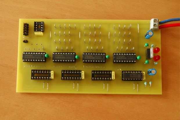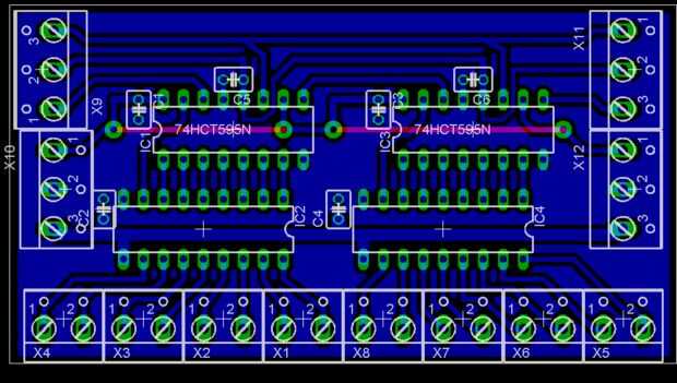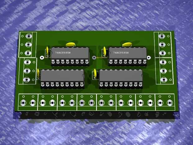 La tarjeta gráfica es sólo un expansor de salida. Se necesitan sólo tres pines del microcontrolador para controlar un número prácticamente ilimitado de salidas de voltaje de alta corriente. Una matriz extra de transistores permiten el ampliador de salida conmutar corrientes más altas que pines del microcontrolador llano. Cada tarjeta de extensión de salida tiene 16 salidas y tarjetas múltiples pueden ser encadenadas junto. Dos cartas debe conducir una réplica de daft punk mesa con 25 plazas. Tenga en cuenta que no se utiliza el multiplexado, es simplemente un ampliador de salida de 1:1.