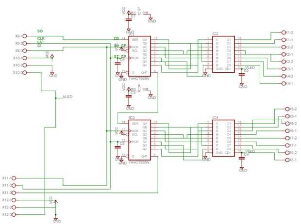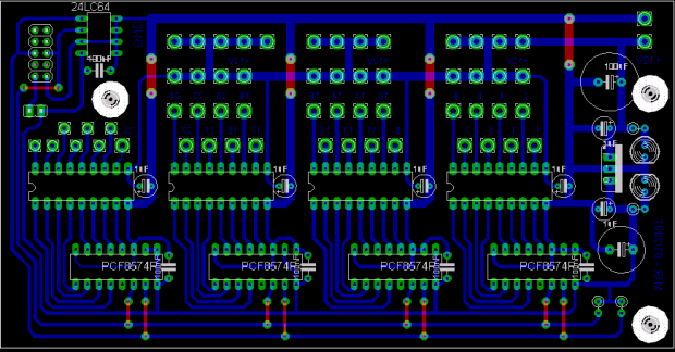 El circuito es bastante básico. Sólo incluye aquellas cosas necesarias para la tarjeta gráfica: expansores de I/O, transistor array, cabezales de conexión. Compruebe la imagen de la PCB para las notas de la foto con una descripción de pines para la placa (la imagen azul abajo).