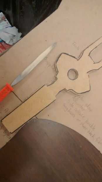 En este punto algunas de las piezas MDF fueron un poco bruto ya que tuve que usar una sierra de marquetería para cortar hacia fuera. Me tomé un tiempo con unos archivos para limpiar un poco. Básicamente sólo tomé todas las capas MDF y les ligan así podía asegurarse que eran de la misma forma. De esta manera que las diferentes caras de los puñales no se verían desproporcionadas ni nada.