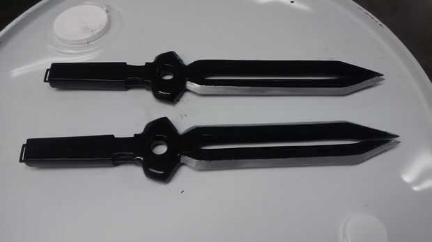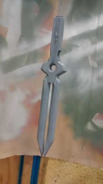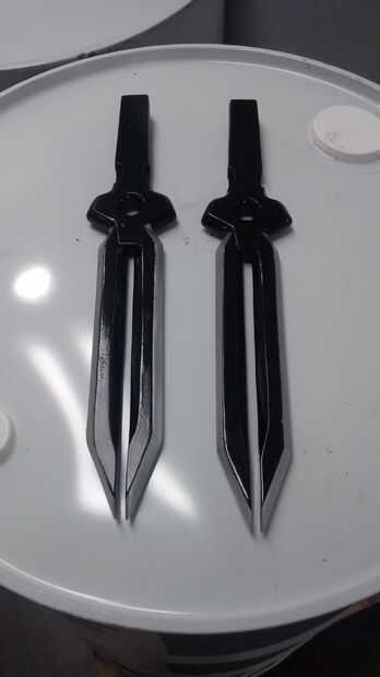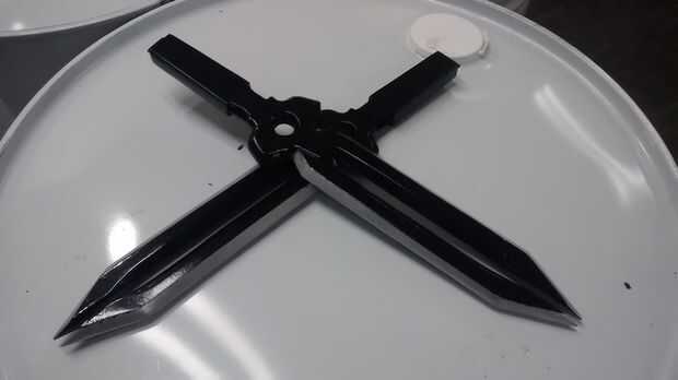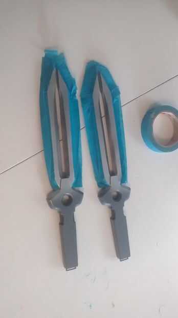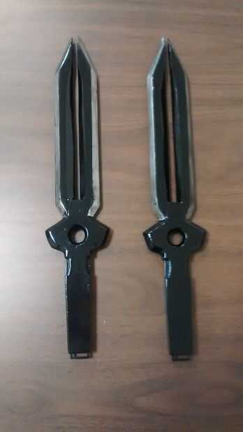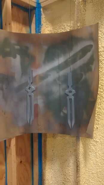 Empecé dándole unas 3 capas de imprimación. Después de esperar las 24 horas requiere de tiempo de curado rociaron con pintura metalizada. En las fotos puedes ver que yo no molestaba rociando las asas con la pintura metalizada. Para estas dagas todo lo que realmente necesita cobertura en es los cartabones de las cuchillas. Dio la pintura metálica un buen rato para curar (más de 24 horas) ya que para la siguiente capa tenía a ellos y no quería que la cinta para tirar hacia arriba de la pintura. Cuidadosamente enmascarado de las zonas que quería seguir siendo de plata con cinta de pintor y luego pintado todo negro brillante.