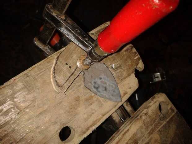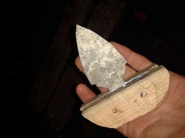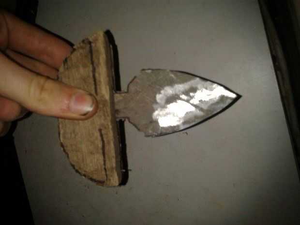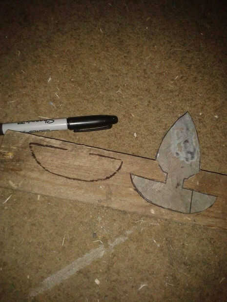 Tomar sólo el mango de la daga y medirlo contra su madera. Usar su marcador para dibujar el mango a la madera y comenzar cortando la forma primero y después por la mitad y de rendimiento dos lados del mango.
