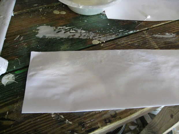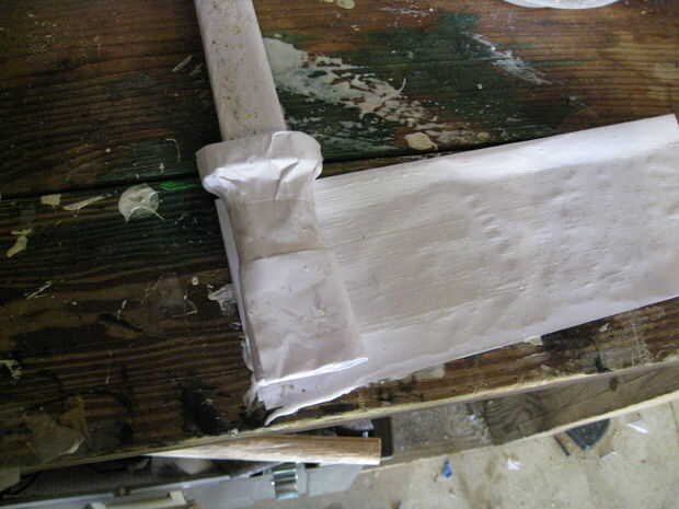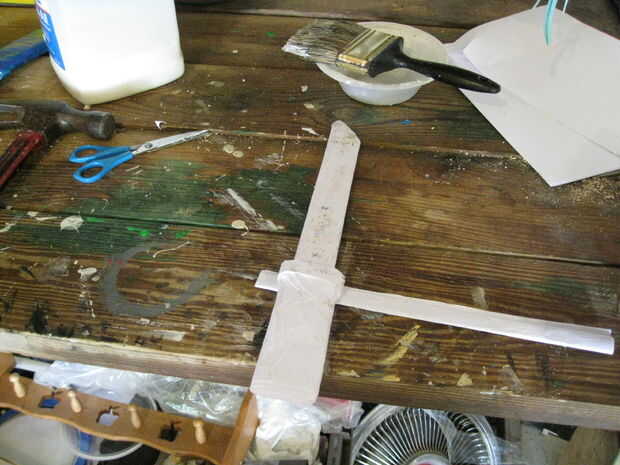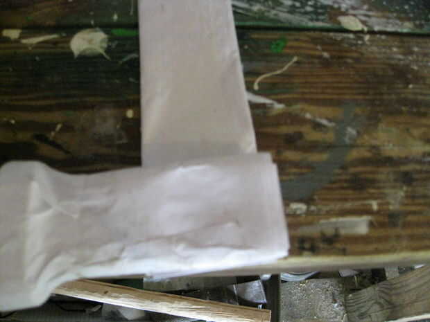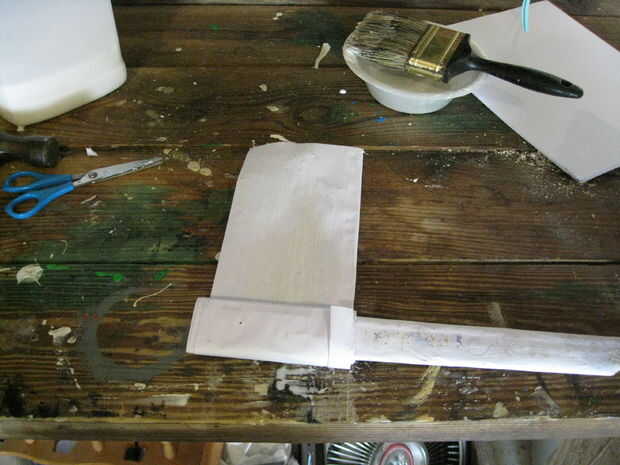 Arrancar como si se tratara de una hoja pero solo use una hoja de papel y Envuélvala alrededor de la parte superior de la manija para hacer un mango más grande del protector (véase cuadro 12). Yo no hice este paso en la daga pintada en el video.