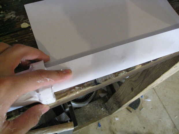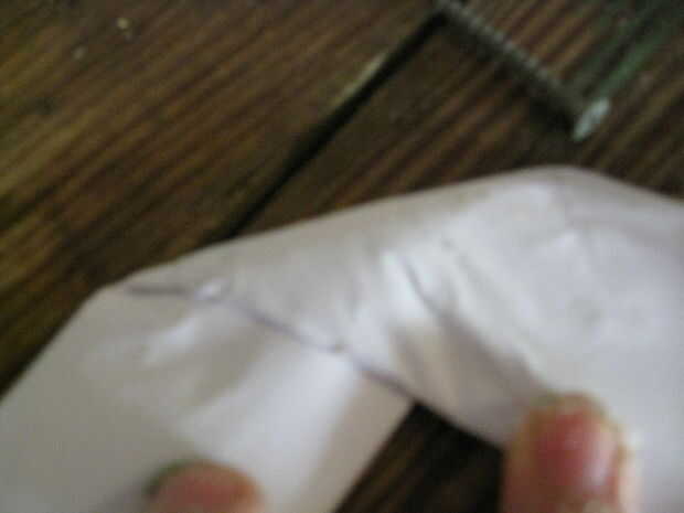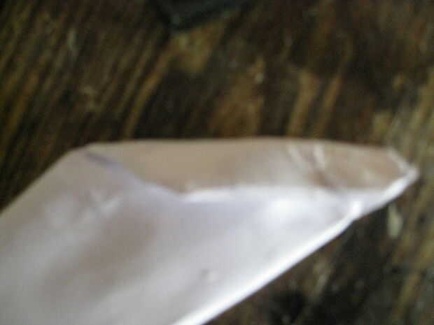 Doble la envoltura para que se ajuste perfectamente alrededor de la punta (ver figura 6). Ahora corte paralelo al pliegue que acaba de hacer la parte plegada de la vaina y encolar la parte doblada hacia abajo (ver figura 7) si te fijas en la nota de la imagen en el cuadro 7 se verá un poco de papel extra que se pega fuera de la vaina, corte que.