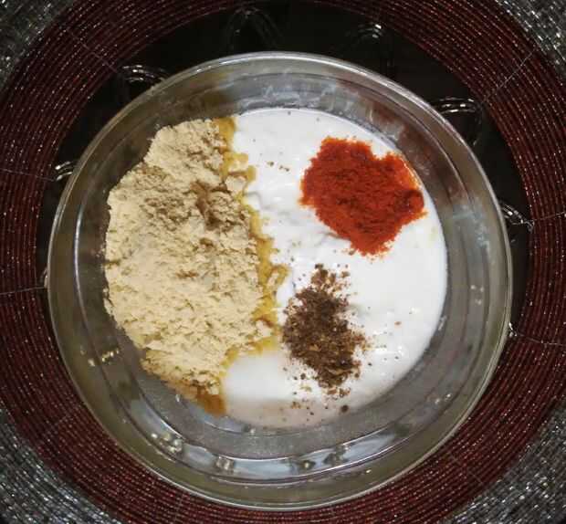 1. en un bol, añadir colgado cuajada, harina de gramo, Chile rojo en polvo, cardamomo molido, canela en polvo y clavo de olor en polvo y sal y mezclar bien.