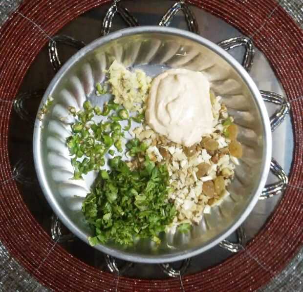 2 en un recipiente aparte, añadir cahewnuts picada, nueces, rasins, jengibre, Chile verde, cilantro y 1 cucharada de cuajada colgado y mezclar bien. Mantener a un lado.