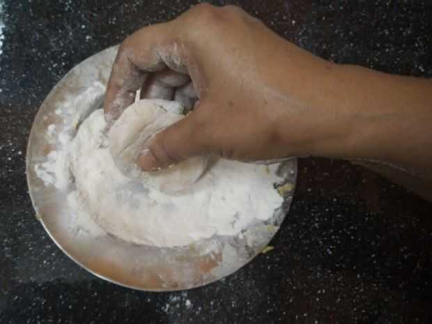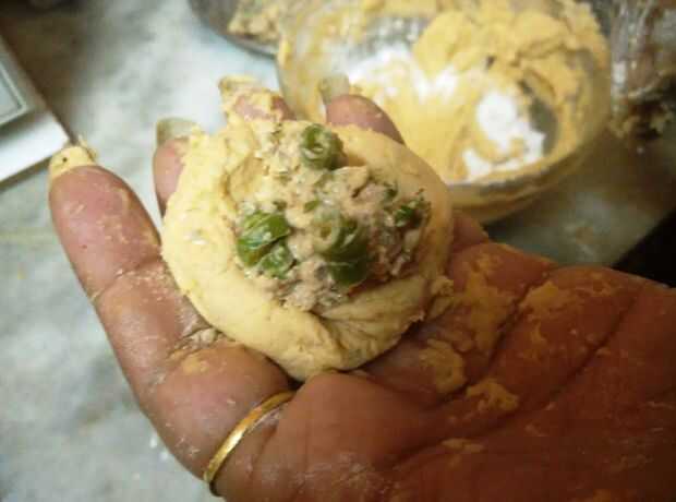1 dividir la masa en pequeñas porciones y rellenar cada porción con la mezcla preparada.