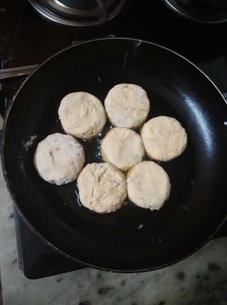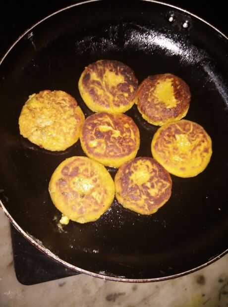 3. calentar una sartén antiadherente y caliente el aceite en él. Porciones de todos ahora bajo fritada preparada, hasta marrón de oro.