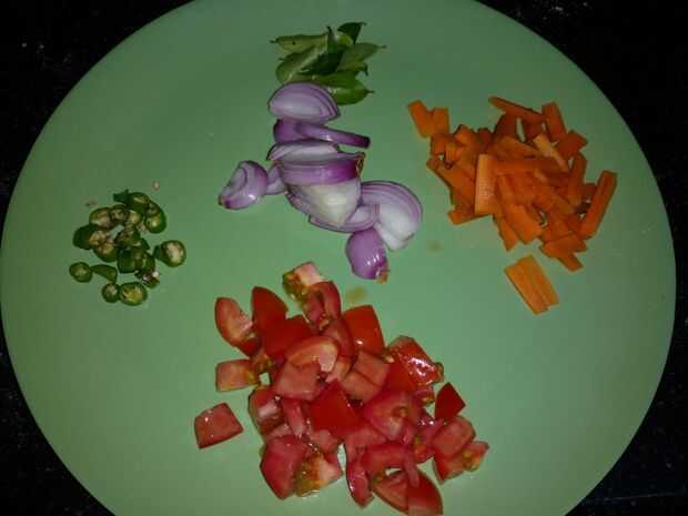Trocear las verduras. Picar la cebolla, el tomate y la zanahoria.