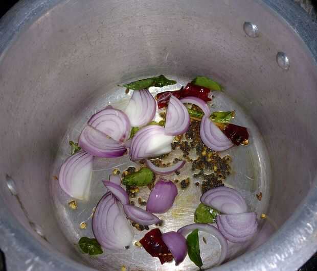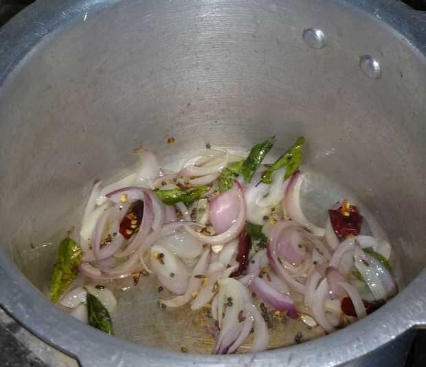 Cuando jeera/comino Semillas chisporroteo Agregar cebolla, ajo y saltear hasta ligeramente doran. Saltear la cebolla hasta transparente.