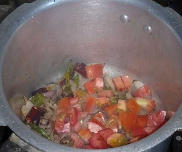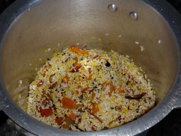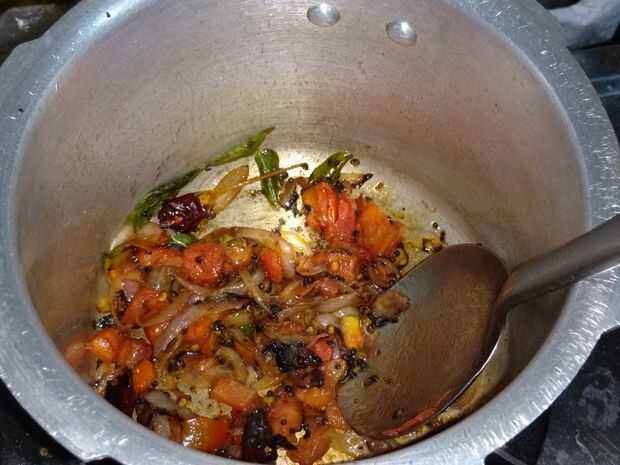 Agregar los tomates y sofría hasta crudo olor sale y es un poco blanda. Luego añadir polvo de cúrcuma y sambar. Añadir arroz y dal. Añadir la sal necesaria. Añadir la zanahoria en rodajas. Rehogar durante 2 minutos.