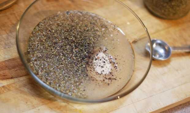 En un tazón pequeño, mezcle su aceite y especias como mejor puede. Algunas de las especias más pesadas tenderá a hundirse hasta el fondo. Eso está bien. (Aquí la imagen es antes que todo lo mezclan)