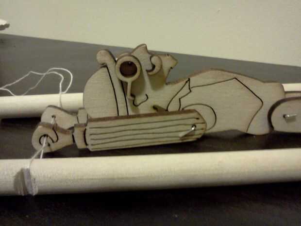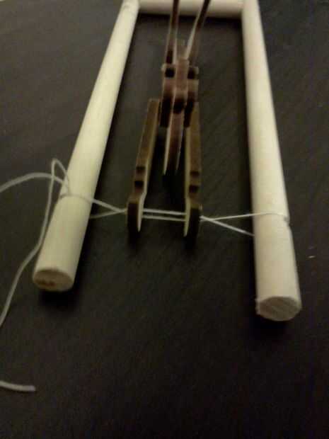 Finalmente a colocar el muñeco a la plataforma en su cadena del trapecio. El truco es a cadena que la marioneta parándose sobre su cabeza por encima del trapecio las cadenas son recta y recta, pero cuando él es colgar lado derecho hay un giro en el circuito de la cadena. Esto recrea el movimiento al apretar las clavijas. Pase la cuerda por los agujeros en las manos y nudo en un bucle bastante ajustado. Tire del lazo sobre los extremos de las clavijas para que se ajuste en las muescas cortadas en ellos.