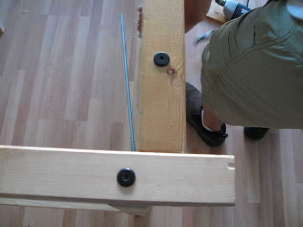 Puesto que los marcos DALSELV son pino blanco, son fáciles de perforar con un taladro con cable. La guarnición para nuestros dos ensambladoras se muestra en la foto. El cabecero más oscuro se ajustó a la estructura utilizando las clavijas clavija.