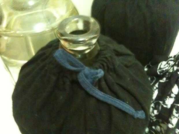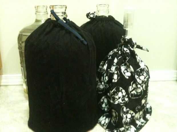 Usted puede elegir cualquier color o patrón de la tela que te gusta pero si quieres algo elegante y brillante que recomiendo forro con una tela negra más gruesa para absorber tanta luz como sea posible. Yo franela negra y hecho 2 x 3 galones entiende, entiende entiende de 1 x 10 galones y galones de 3 x 1 por $20 que es un poco más barato de compra 6 toallas, que incluso no llegan a cubrir los 10 galones... y salir del cubo. (OK, por lo que no es realmente un acogedor de Damajuana en ese momento pero suena mejor luego cubo acogedor!)
