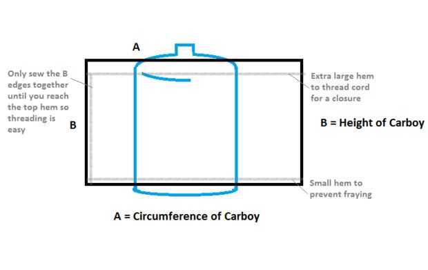 B = la altura de la Damajuana más 2,5 cm (1") para el dobladillo en la parte inferior y unos 5 cm (2") para un dobladillo extra grande que puede rellenar el cable tirando a cerrado en la parte superior.