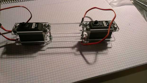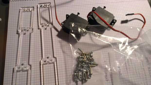 Ambos servos del perno como se muestra en la imagen a cualquiera de las piezas de acrílico, no importa que. Lo que importa es conseguir la misma dirección.