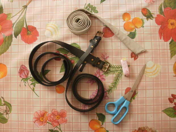 No había muchas cosas que necesitaba: 2 cinturones de cuero negro (1 estrecho, 1 nivel) 1 correa de estilo gabardina gris 1 hebilla de cinturón Materiales (hilo, tijeras)
