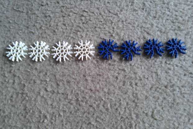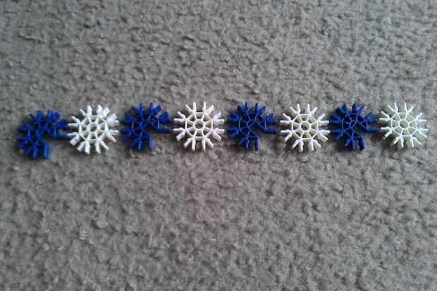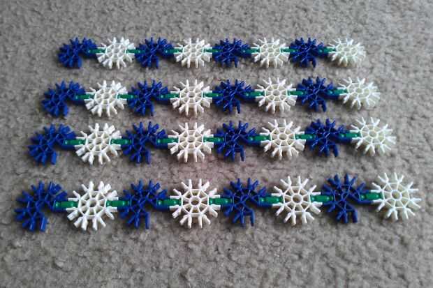 Cuatro conectores blancos y cuatro conectores azules y organizarlos en un patrón alterno tal como se muestra. Conecte las piezas con barras verdes. Repite de cuatro piezas.