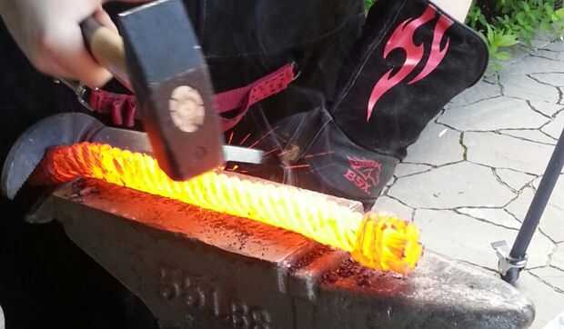 Después de cada paso, hasta que estés seguro de que la sección es una pieza homogénea de acero, usted debe cubrirlo en bórax antes de colocarlo en el fuego. Capa la pieza cuando es un color rojo opaco se asegurará de que el bórax se pega. Un punto acerca de bórax es que cuando está caliente es muy cáustico y puede destruir el interior de su fragua, así que asegúrese de que tiene un pedazo de ladrillo refractario o algo para proteger la base de la fragua. Además, bórax caliente saliendo de la pieza en el siguiente paso puede ser bastante doloroso y pueden dejar cicatrices así que asegúrese de llevar el equipo apropiado. La última parte de la soldadura de la fragua es la parte real de la soldadura. Una vez caliente la pieza, puede comenzar golpeando. La idea es golpear en una plaza bar al principio. Mientras que alrededor de la barra, debe seguir la torcedura del cable. Personalmente, prefieren empezar a golpear en el centro y mi forma de trabajo hacia fuera. Golpear hará que las fibras así separadas hasta cierto punto así que cuanto menor sea la distancia desde el primer golpe hasta el final del golpe menos se producirá la separación. Se sabe que la pieza es homogénea basado en el cambio de sonido que hará que la pieza al ser golpeado. Initiall, será más de un sordo chasquido con cada golpe, pero una vez homogéneo que hará un poco más de un sonido de ping. Una vez homogéneo puede ser golpeado en la forma preferida.