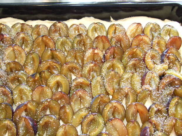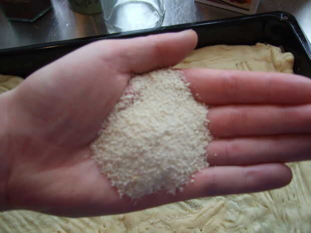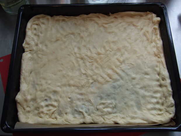 -obtener su rodillo, harina y comenzar a rodar la masa. Esto podría ser un poco difícil, la masa será probablemente bastante elástica pero al final tendrá éxito :) Transferir la masa enrollada a su bandeja para hornear y llevar al tamaño correcto, arrastrando a las esquinas.