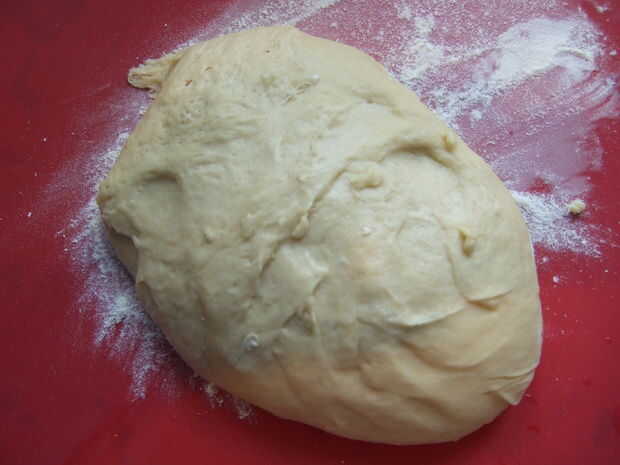 -poner la masa sobre una superficie ligeramente enharinada y golpee abajo una vez