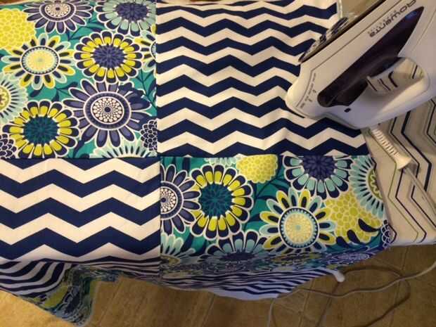 3. una vez que las plazas se cosen juntos, dale la vuelta y plancha los bordes cosidos en una luz arriba y abajo de movimiento para evitar que a la tela de estiramiento.