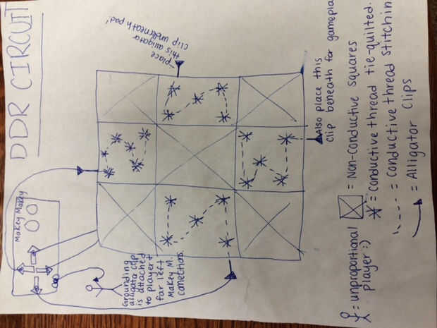 * La última foto de este paso incluye un diagrama dibujado a mano de la circuitería de la costura así pedir las conexiones MaKey MaKey que serán explicadas en la página siguiente. Pido disculpas por mis habilidades de dibujos y la posición horizontal, pero que aún puede servir como una guía informativa durante el proceso de fabricación.