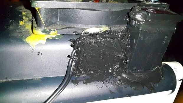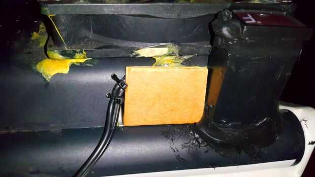 Para un fuerte pasaje de aire de refrigeración en el radiador caliente, necesitan sellar este vacío bajo el ventilador de extracción. Utilizando una pequeña sección de adhesivo de silicona negra y cartón, el vacío está ahora sellado.