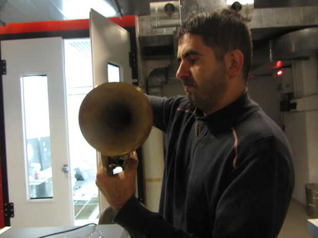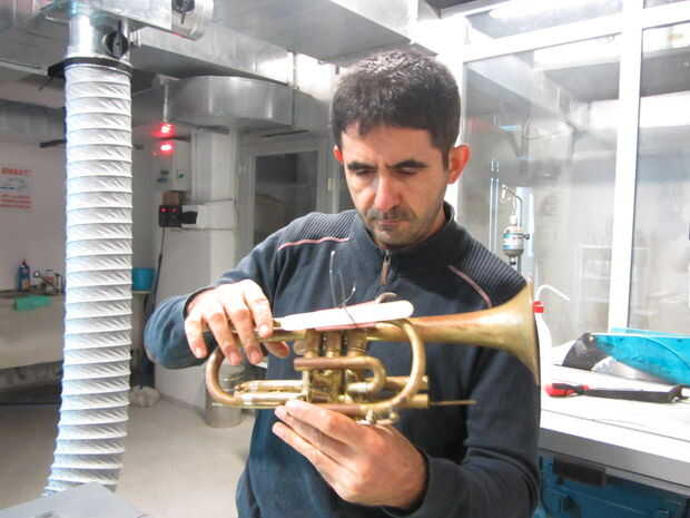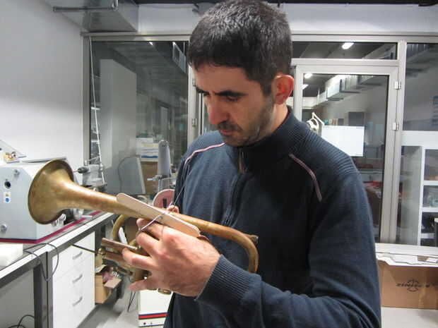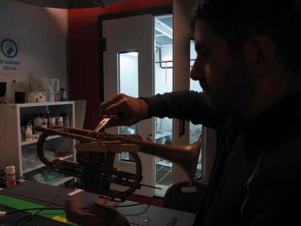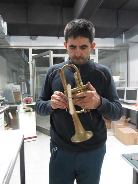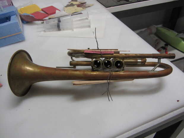 En los lugares donde se necesita un movimiento más lento y constante, he utilizado cables de acero, envuelto alrededor del instrumento, conectado los dos extremos del alambre juntos y y ese extremo con los alicates lentamente, aprieta el alambre envuelto así exprimir el área del instrumento donde se envuelve el bucle del cable, reunir piezas del instrumento, lo que los hace moverse en sus posiciones originales. He utilizado unos palillos de madera para extender la fuerza aplicada uniformemente sobre el tubo de cobre amarillo suave para evitar que se dañó por los cables.