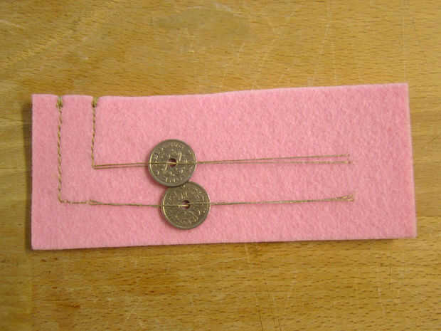 Ahora pista trasera y coser nuevamente por el agujero de la moneda, pero esta vez coser a través del orificio de la manera opuesta que cosido a través de él la primera vez!