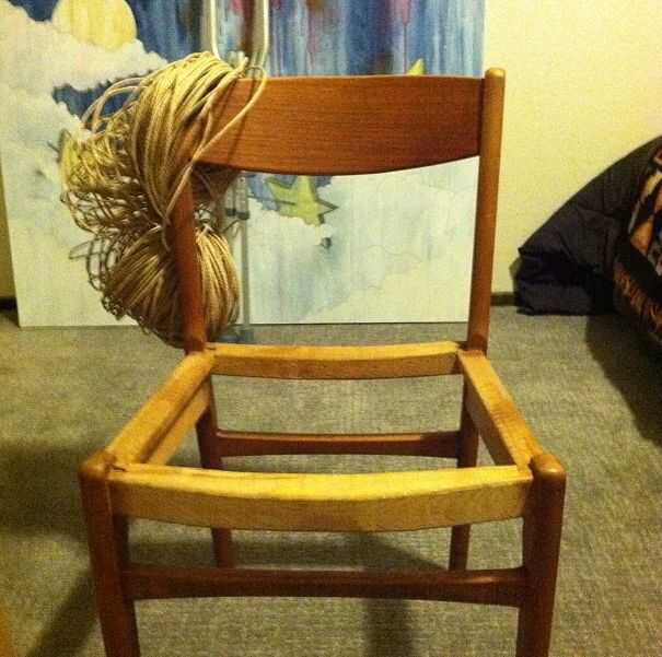 Comenzar a preparar su silla por recortar todo el cable original de la cuerda. Como se puede ver en esta imagen, quité todas las uñas, que es un gran error. Este fue mi primer intento de tejer el asiento, y con todos los clavos quitados, perdido el original espacio para el cable de la cuerda. Junto con el espacio, también perdido donde el tejido comenzó y terminó.