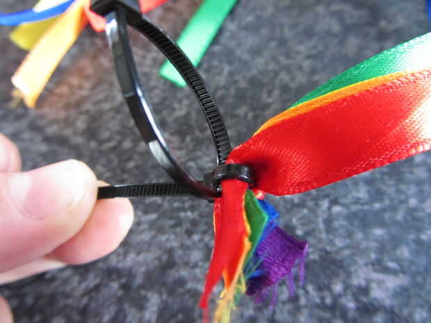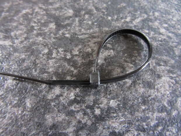 Abrigo de las cintas perfectamente apiladas alrededor de la atadura de cables dejando un poco de cinta en un lado (echa un vistazo al segundo diagrama) y poner otra atadura de cables a través del lazo.