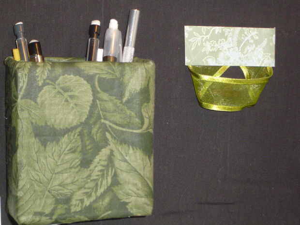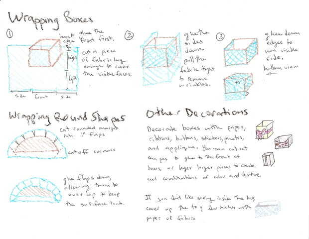 Corte un pedazo de tela que es más grande que la cara frontal de la caja por el ancho de la caja + 1" todo el camino alrededor. Pegar a la tela a la parte delantera, dejando un margen de 0,75" para meter la parte superior. Luego pegue los lados abajo, asegurando los bordes en la parte posterior de la caja con alguna cinta adhesiva para mantenerlo en su lugar mientras el pegamento seca. Doblar a la tela en la parte inferior de la caja para que los bordes se acaban en la espalda, algo como doble envoltura de regalos en un regalo. Se pueden añadir unas tiras de papel decorativo, etiquetas, botones, cintas o pequeñas fotografías para mejorar la apariencia.