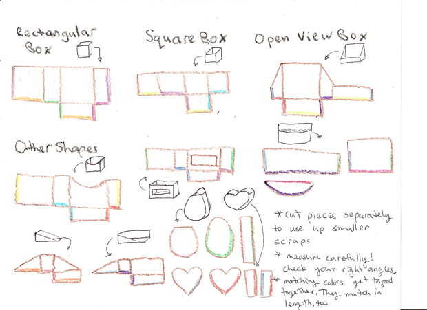 Cada caja se realizará fuera de cinco piezas: dos piezas de lateral, delantero y trasero y un fondo. Asegúrese de que la altura, anchura y profundidad coordinan en todas las piezas y que se corte las esquinas de 90 grados. Simplemente con cinta adhesiva los bordes para armar.