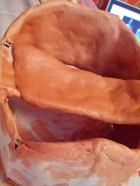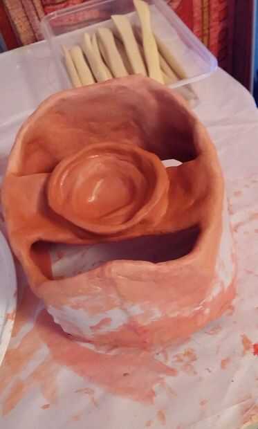 Después de leer consejos sobre cómo básicamente agua es tu amiga. Yo no use cualquier manos sólo guantes y mantuvo un fregadero lleno de agua jabonosa tibia en mi baño para lavar la arcilla de las manos fácilmente cuando sea necesario. Experimenté con mezcla de pintura en la arcilla mojada pero por el tiempo de que había moldeado en forma hecho apenas hay diferencia en el color original de la arcilla y básicamente sólo había hecho un lío en el proceso con no pagar así que no estoy seguro de qué aconsejar en eso. Me decidí a pintar la máscara de los colores de la derecha después de que seca pero todavía no he tenido tiempo para hacerlo. De todos modos así que seguí práctico;