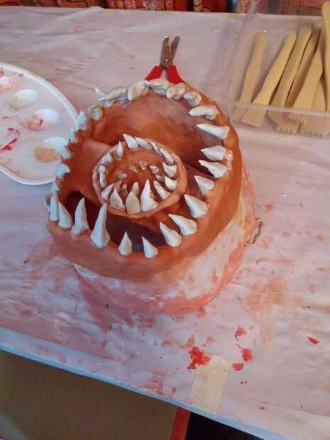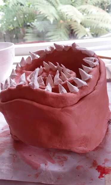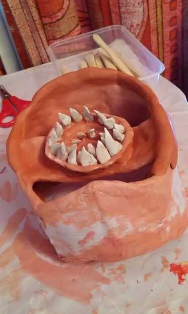 Puse abajo la arcilla sobre el borde del marco frontal y luego scoop/torció diente agujeros en esa "goma", y luego une los dientes. Unos días más tarde volví y forma un borde de la boca de lamprea arrugada alrededor de la superficie de la máscara, de forma que la capa de abajo parece emerger como la goma.