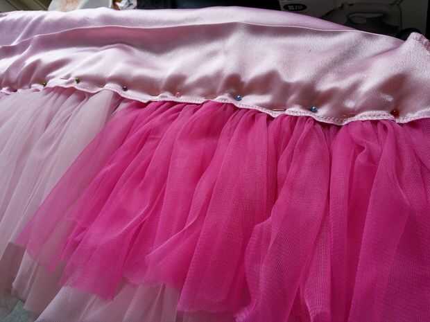 2. perno de la parte inferior de la cintura de satén para el tutú por debajo de los nudos de la parte inferior. Asegúrese de que todas las tiras de malla son planas y hacia abajo cuando la fijación como para no terminar con extraño en forma de tutú.
