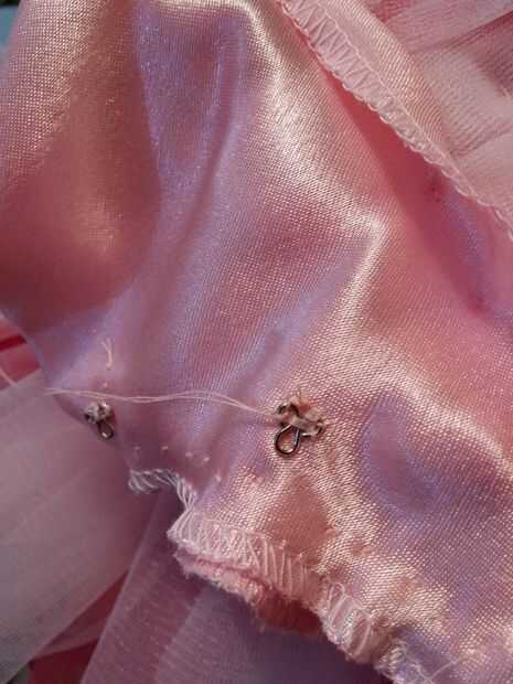 2. con el tutú aún vestido sobre la cintura de la dressform, he cosido todo a mano y escondido el forro polar + tiras en los bordes de la cintura en completamente en el satén.