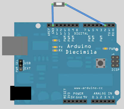 Una vez que hayas subido el firmware, es hora de armar el circuito. Allí realmente no es mucho a él - usaremos una resistencia de pull-up interno en el chip, por lo que todo lo que necesitas hacer es conectar los extremos de los dos cables que soldado en su conmutador en la placa de Arduino: uno va a tierra, otro a una entrada digital (supondré #2 en el resto del tutorial).