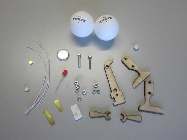 - Cerca de 10 por 10 cm de tieso grueso 3mm hoja de tela, realizable con la Sierra de contorno o un lasercutter. Elegir el catálogo de Ponoko Alemania contrachapado de abedul de 3mm. Me fui realmente un poco decepcionado por la cantidad de verdad saliendo, ya manchando la superficie durante el transporte. Para mi próximo pedido estoy pensando en probar la hoja termoplástica rígida, como placa de acrílico. Como no se utiliza enclavamiento, el diseño no es fundamental para el espesor de la hoja. Sin embargo un grosor inferior a 2 mm puede hacer la parte de "cuello columna" inclinarse a los lados mucho. Y material más grueso de 3mm tornillos más largos y mayor apertura en las pelotas de ping-pong inferiores.