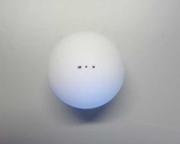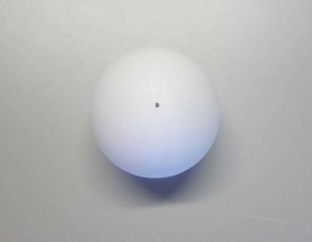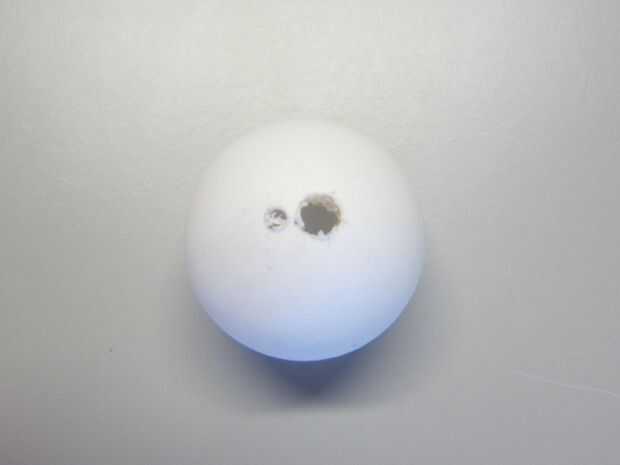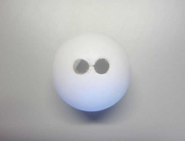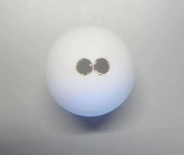 Perfore un agujero de 6 mm en cada una de esas marcas pasadas, dejando sólo un pequeño puente en el medio. Utilice una broca muy agudo y no ejercer demasiada fuerza en él, para no abollar la bola. Puede ayudar a pre-taladro con una broca de diámetro más pequeño (por ejemplo, 3 mm). Eliminar excesivas rebabas con una lima redonda delgada (diámetro < 6mm).